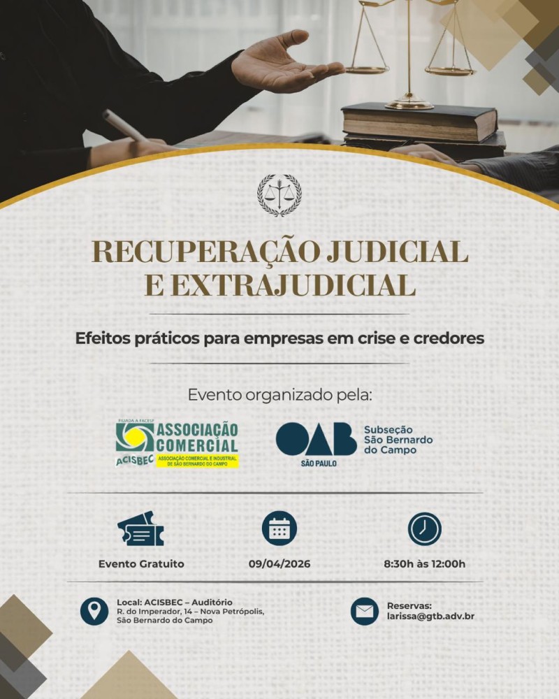 A ACISBEC e a OAB São Bernardo do Campo promovem, no dia 09 de abril de 2026, o evento “Recuperação Judicial e Extrajudicial – Efeitos práticos para empresas em crise e credores”, com o propósito de oferecer uma abordagem técnica e prática sobre temas centrais da reestruturação empresarial e da preservação de créditos.