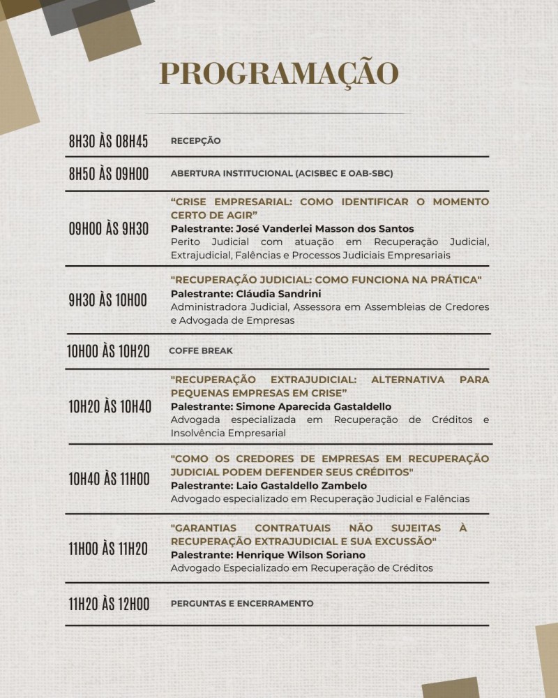 - 9h30 às 10h: "Recuperação Judicial: Como funciona na prática"