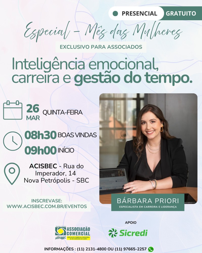 No Mês das Mulheres, a ACISBEC promove um encontro especial voltado ao desenvolvimento humano, carreira e inteligência emocional.