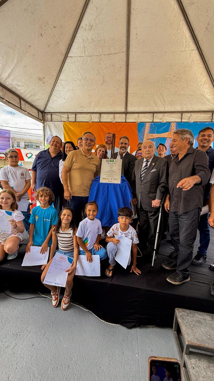 Monumento instalado no Centro reuniu autoridades, crianças e lideranças; conquista é fruto de luta histórica da ACISBEC e emociona idealizador Gaetano Luigi, de 88 anos