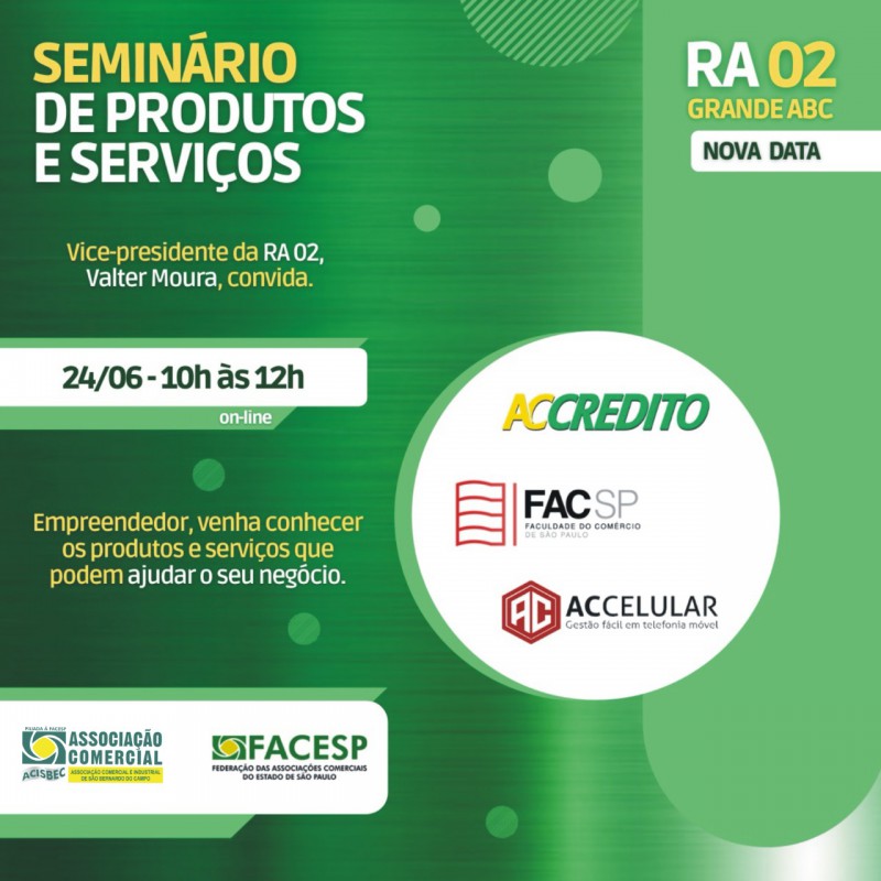 O primeiro seminário on-line de produtos e serviços da FACESP (Federação das Associações Comerciais do Estado de São Paulo) para a RA-02 Metropolitana ABC será realizado dia 24 de junho, das 10h às 12h. O evento faz parte das ações previstas no Plano de Fortalecimento da rede das associações comerciais